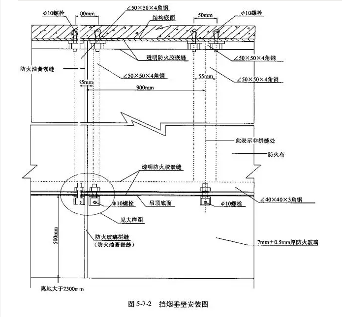 擋煙垂壁、垂簾應采用不燃燒材料制作,目耐火極限不低于0.5h。用于吊頂以下時,吊頂下沿車站縱向下掛設置的擋煙垂壁選用遞明加絲防火玻璃,高度為吊頂下500㎜.當吊頂為鏤空吊頂時,吊頂上部的擋煙垂壁應向上延伸至結構粱。不僅可以滿足擋煙防火功能需要,更因其通透性好,擋煙垂壁離地面不應小于2. 3m。